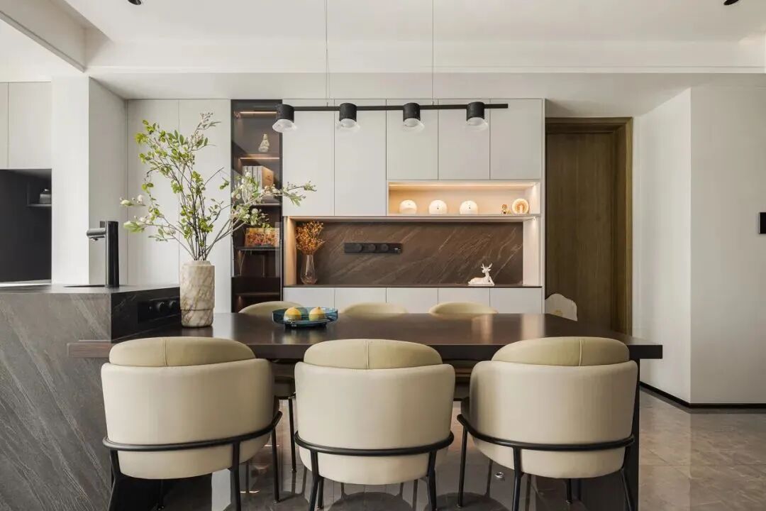 桌椅:多人家庭建议选圆桌,空间小选长桌。木质、石材餐桌比较百搭,能够适配各种风格的餐厅。 装饰:餐厅墙面较空可选择装饰挂画;餐桌最常用的摆件是花瓶。