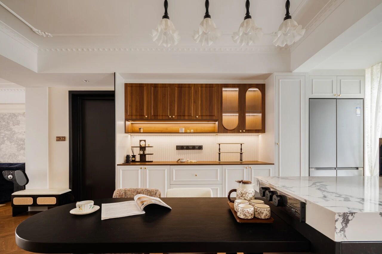 毕竟生活中好打理的岩板餐桌比易渗油渗污还笨重的实木更讨喜,全屋瓷砖通铺比易开裂的艺术漆墙地面更好打理……