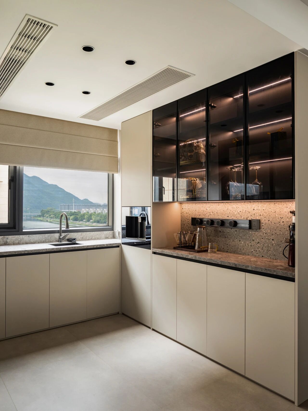 而对于喜欢收集漂亮杯子的人来说,餐边柜可以单独做一个展示杯子的区域,装上玻璃柜门,美观又防尘。